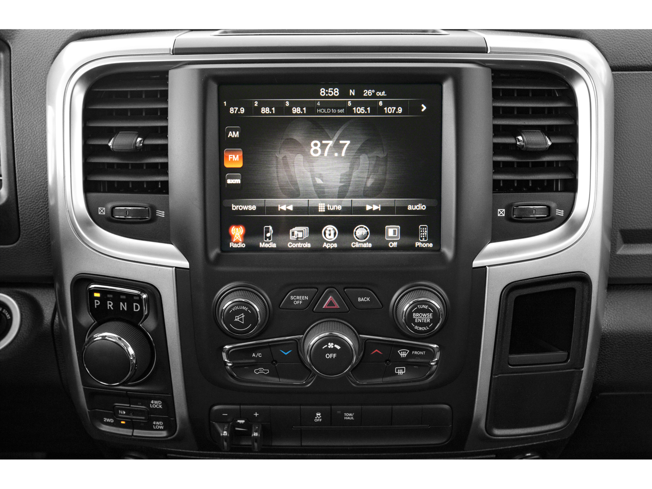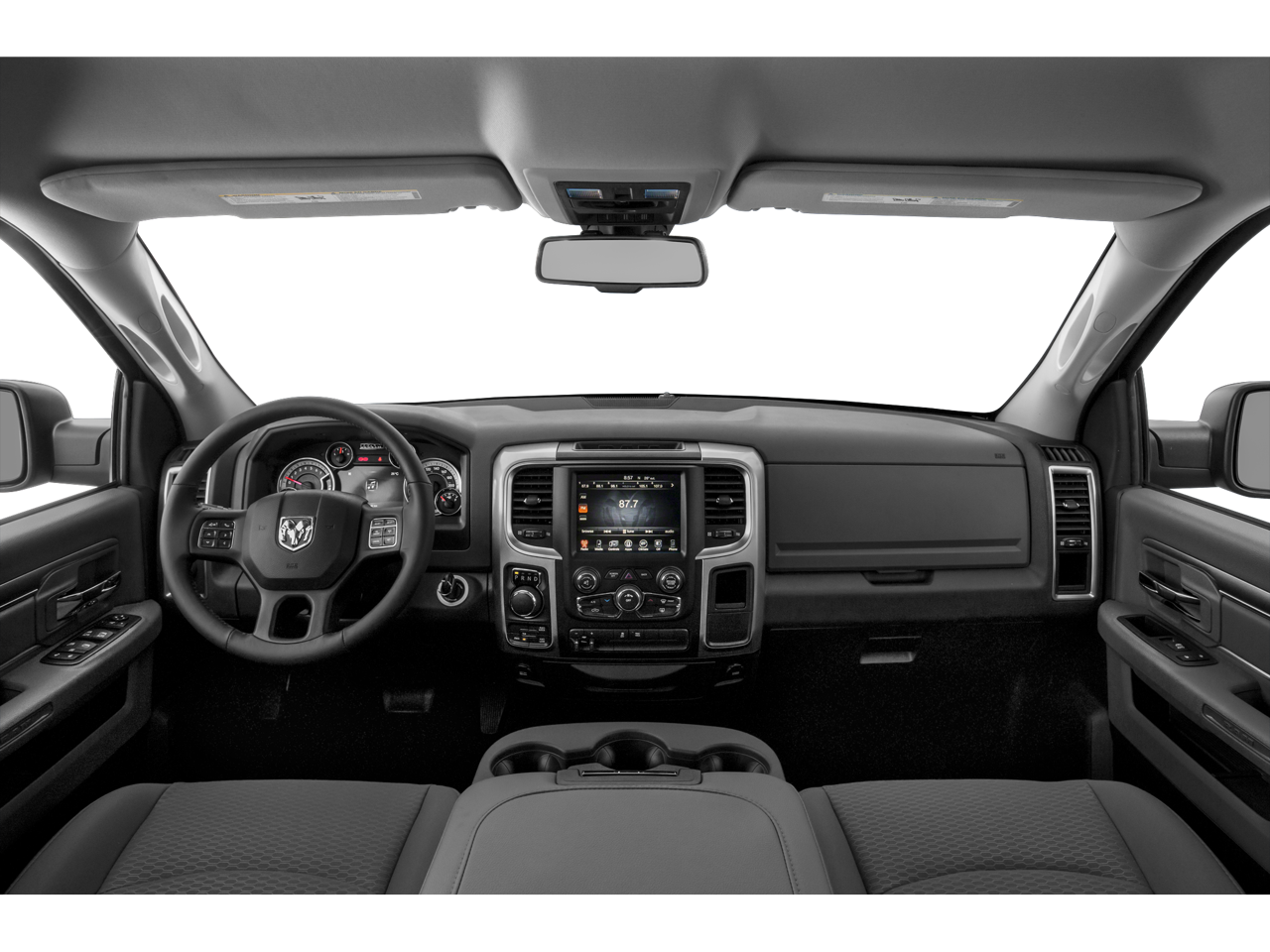 Spacious Crew Cab seats six with **Cloth 40/20/40 bench**, rear folding seat, **Uconnect 3** 5 touchscreen, **SiriusXM**, **Bluetooth®**, steering-wheel controls, power windows/locks, cruise, and air conditioning.
